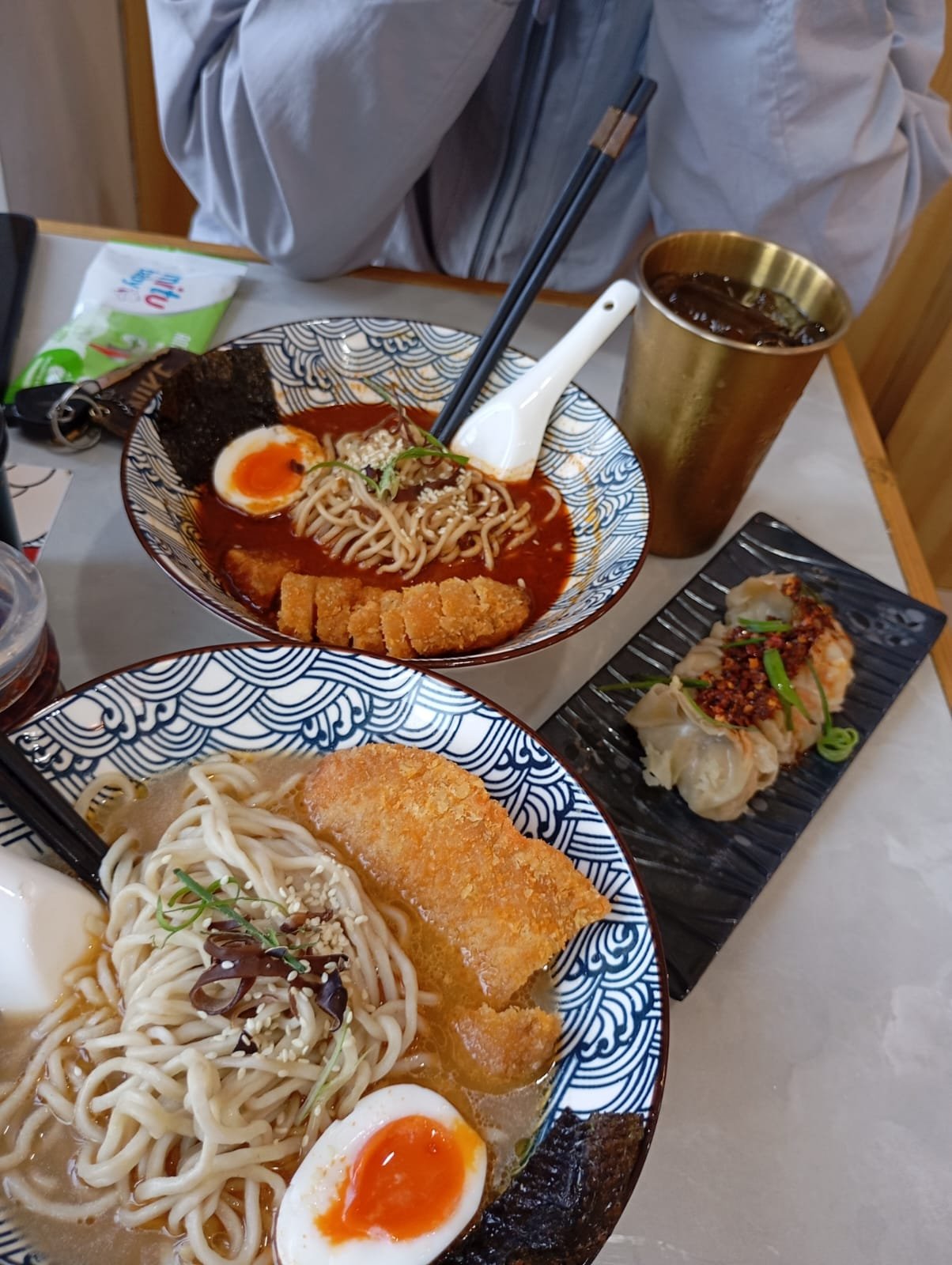 Saya makan ramen dengan kuah yang hangat dan rasa yang lezat. Mi-nya kenyal dan disajikan dengan topping yang melengkapi rasa. Ramen ini enak dan cocok dimakan saat lapar atau cuaca dingin.